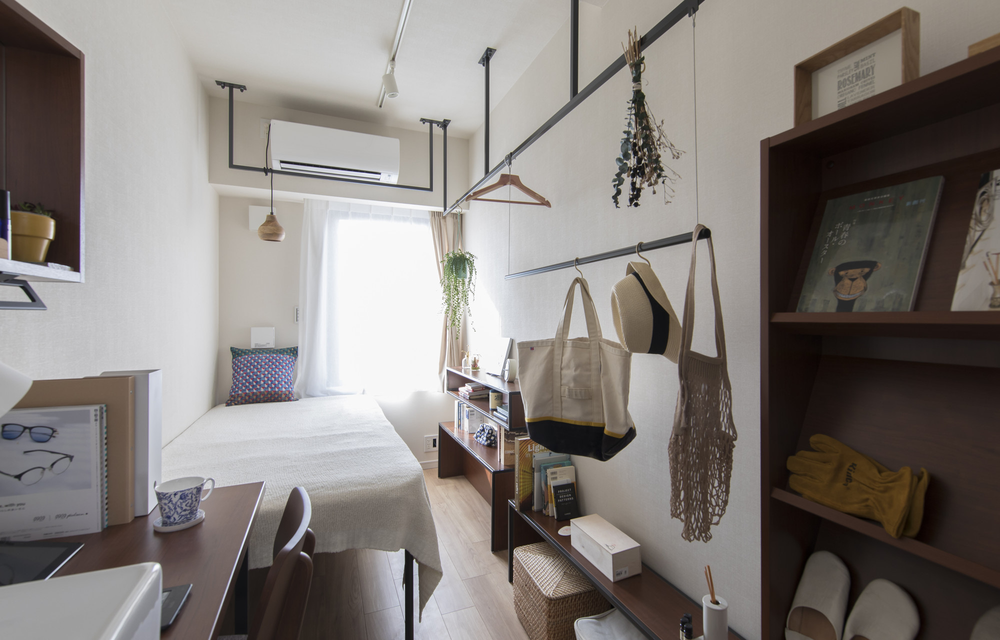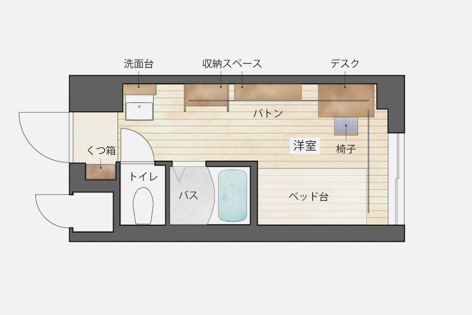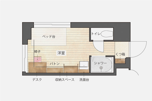 付属備品照明、デスク、イス、ベッド台(マットレス要購入)、壁面収納、ハンガーラック(バトン)、シューズラック、Wi-Fi、光回線インターネット