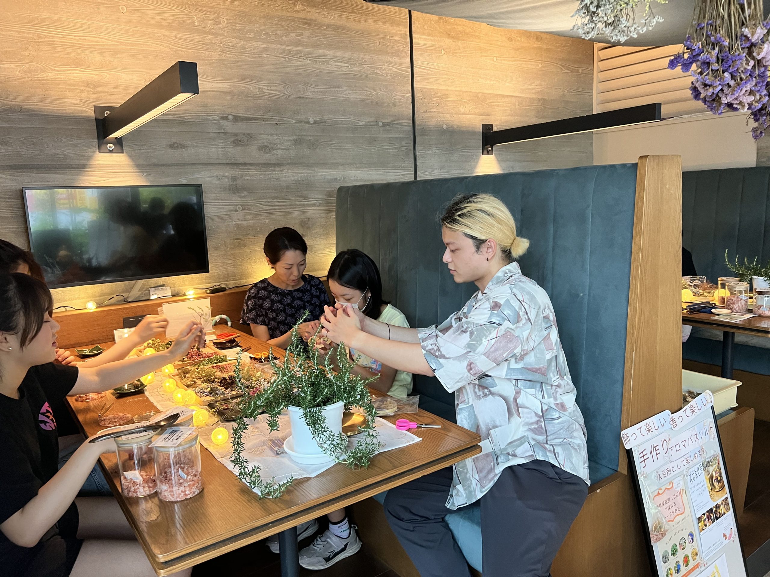 アロマバスソルトワークショップも老若男女が気軽に参加でき、各々の作品を作り上げていました。